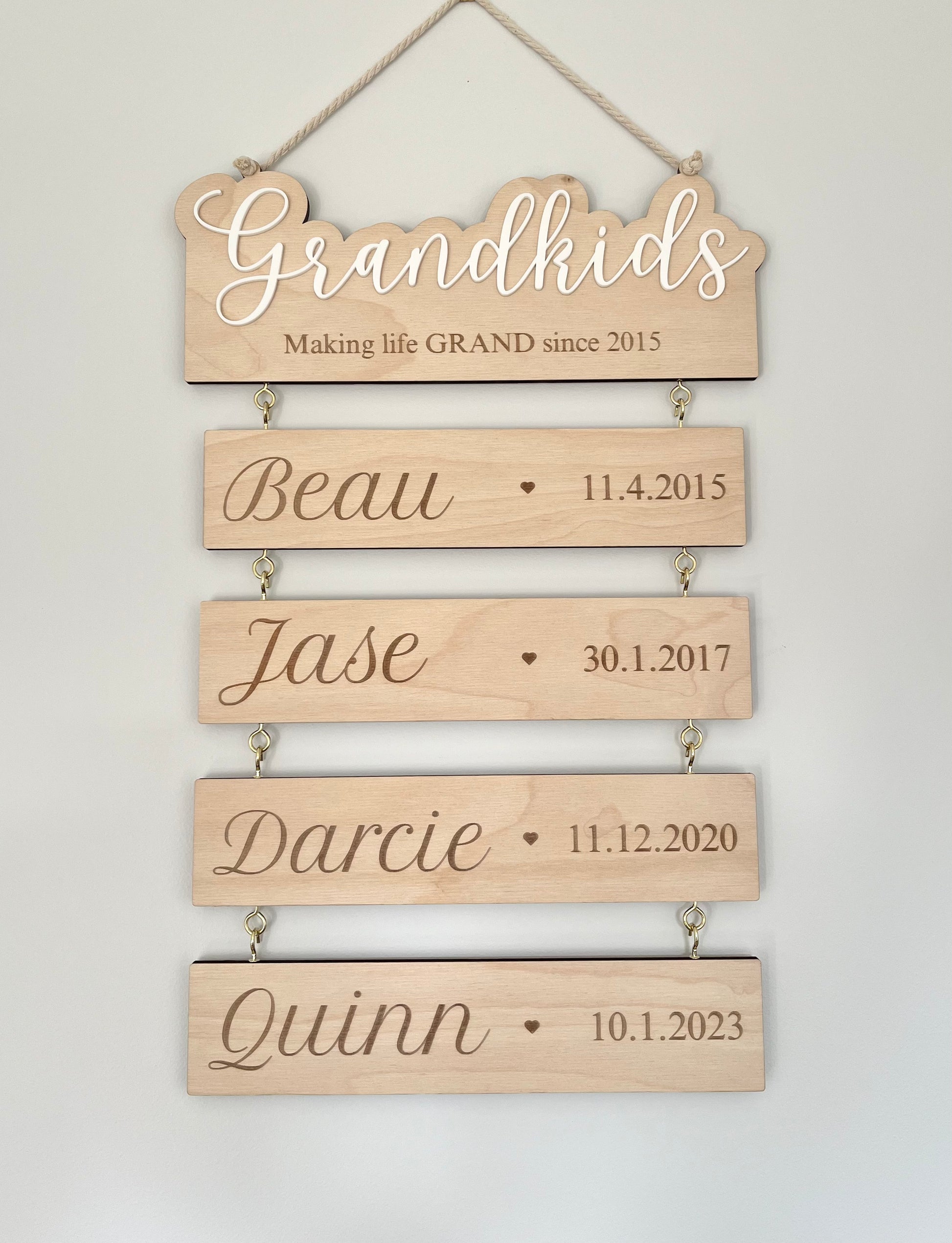 Our Grandkids Wall Hangings are the perfect gift for every grandparent, personalised with each grandchild’s name and birthday.