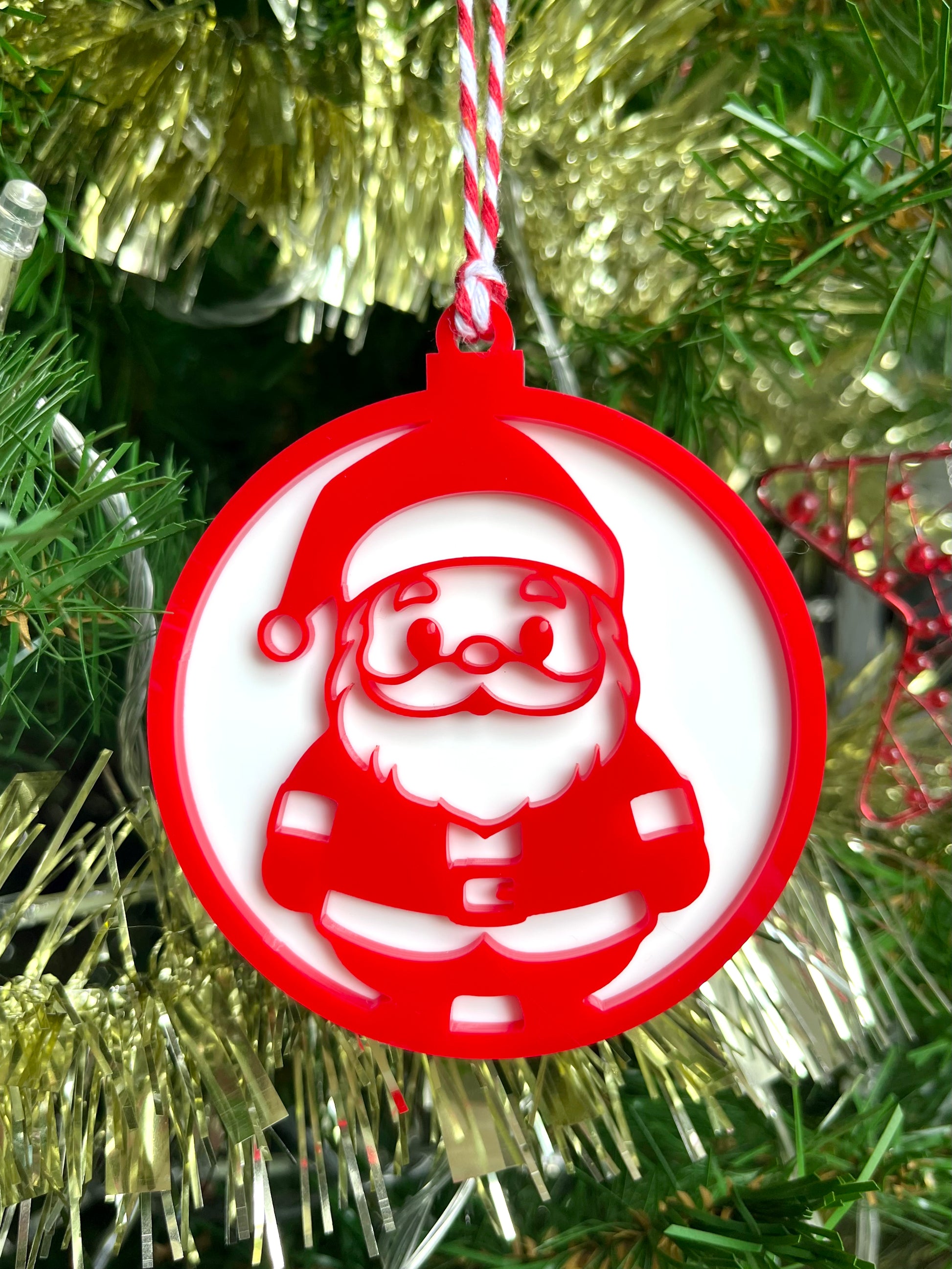 Featuring a bright red Santa graphic on a snowy white circular backing, this playful piece measures 8cm in diameter and is laser cut and layered using 3mm acrylic.